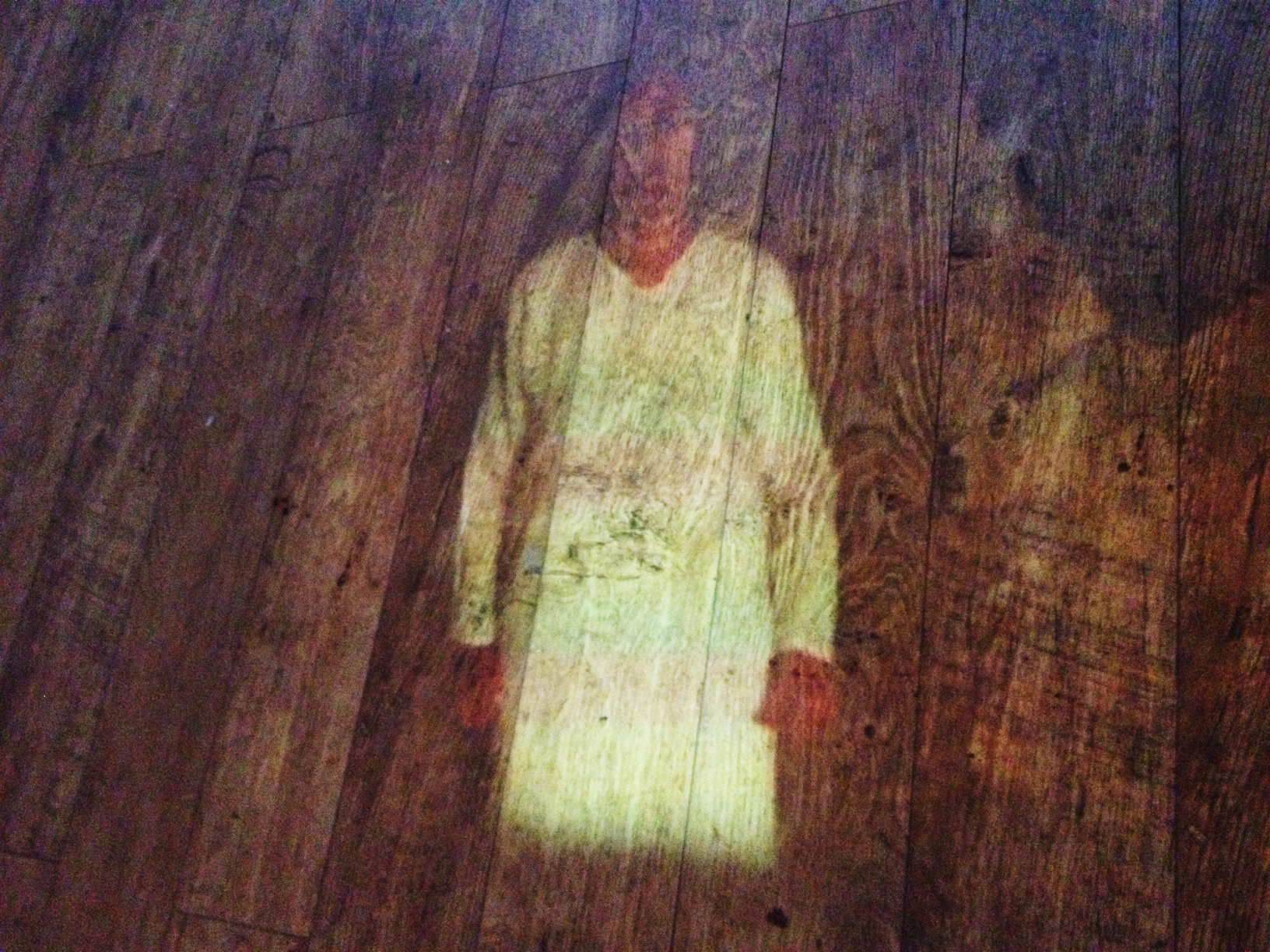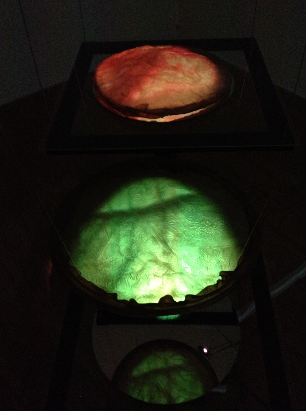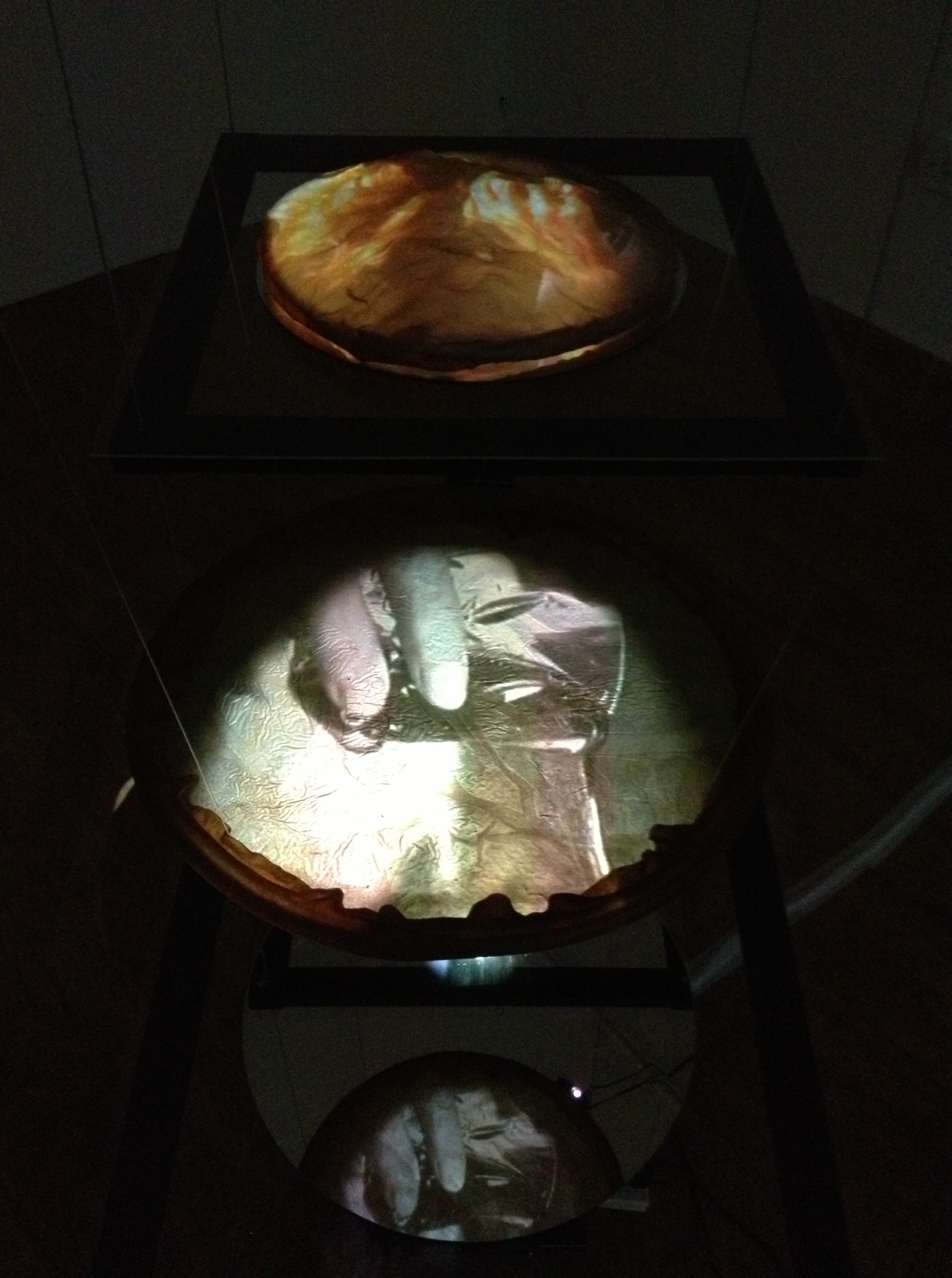 Stehlíková filmed her grandmother, mother and daughter in their country house in Bohemia, focusing her camera on the bonds, tensions and displacements between the generations. Driscoll’s sculptures are made of translucent, amber-colored rawhide (dried cow skin), which receive and transform the video projections. The projected light animates the sculptures, while their visceral physicality reveals a hidden dimension under the women’s seemingly composed surfaces. Four groupings of sculpture sit on suspended perspex platforms that float in the dark “underworld”.