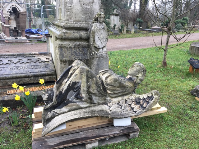 Diana pointed out to me various types of stones and their origins, which are often from quite faraway. Stone was brought over to London by sea, canals, and later by railways. There is a lot of Portland stone at in the cemetery brought over by sea from Portland. Portland stone is the favoured building stone of London as it was easy to load onto ships directly from the quarries around the island. Wren was the first to bring it in any quantity for rebuilding the City churches after the fire of 1666.