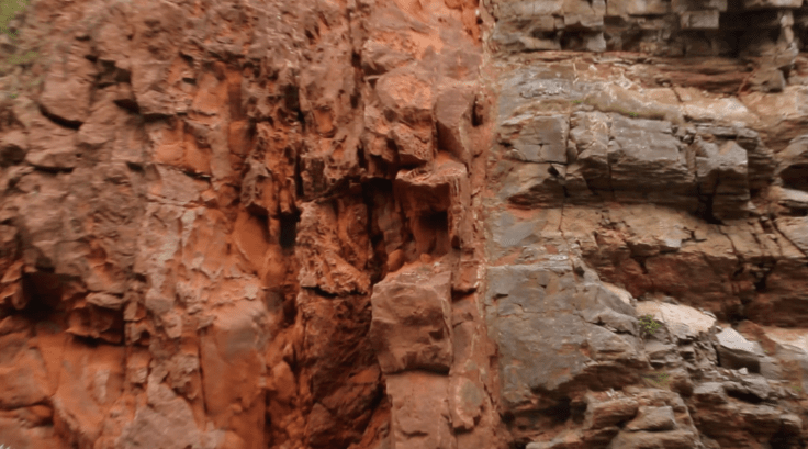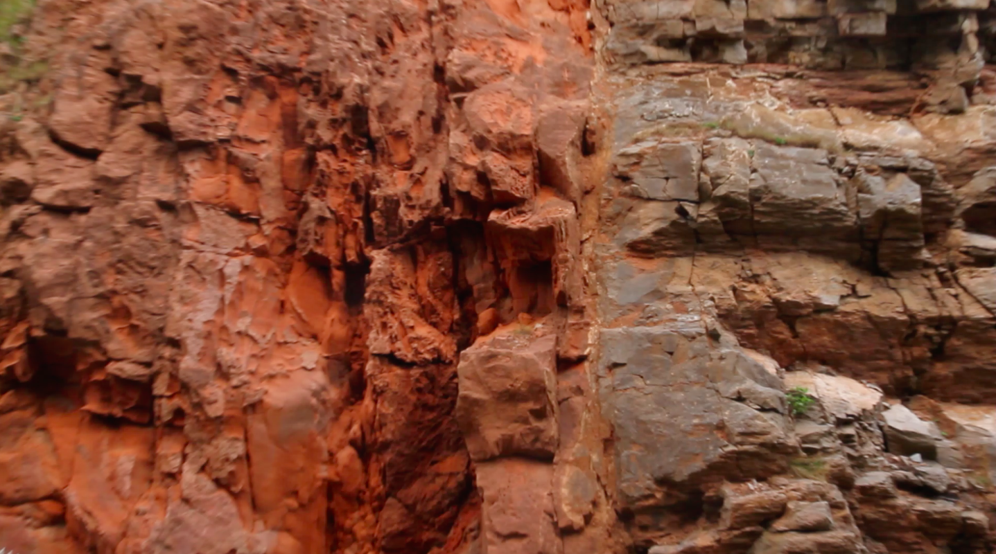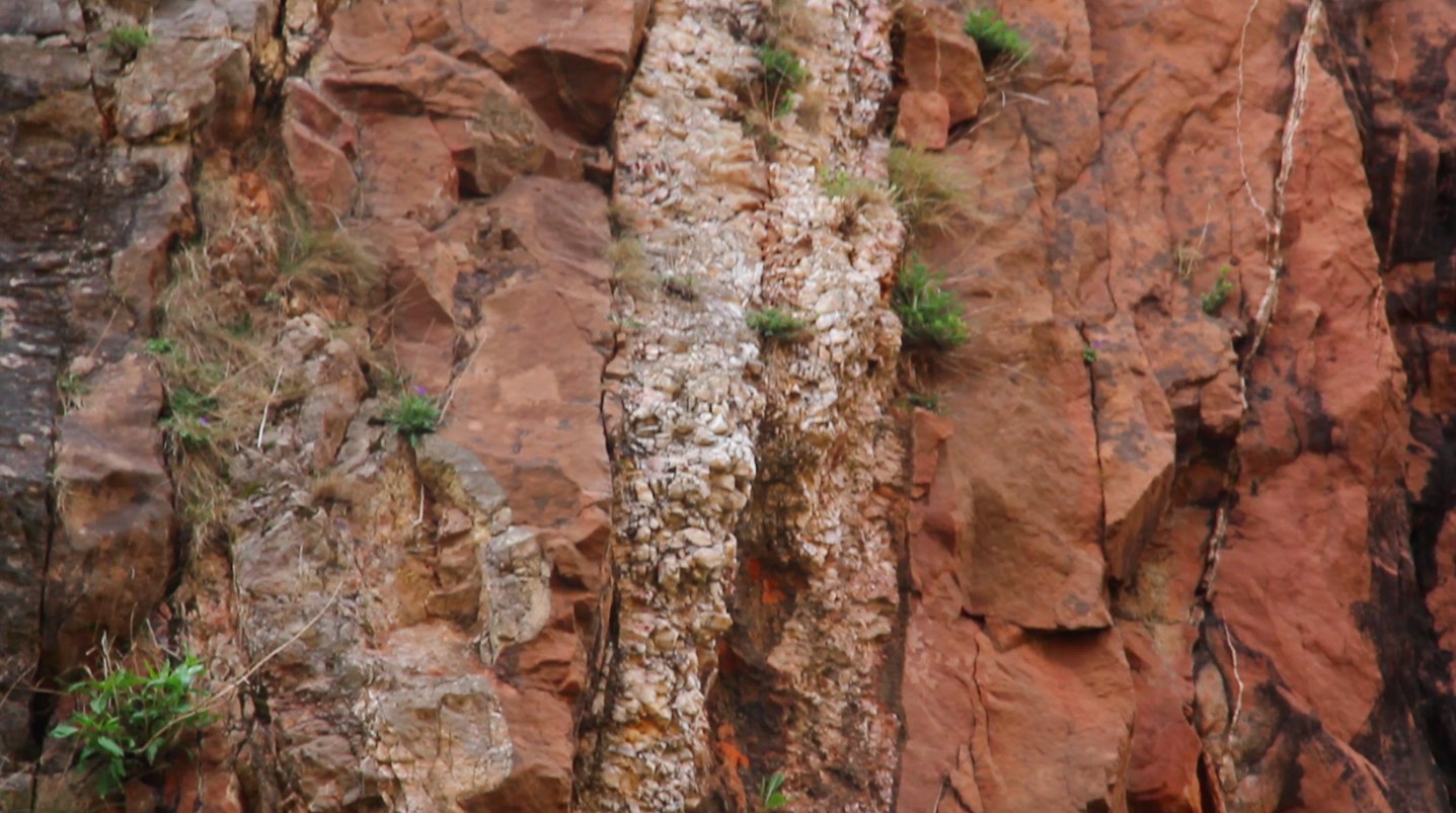 Here lime stone, created in a relatively peaceful environment, through slow deposition of sediments (such as corals in tropical seas), with horizontal layers of sediment. Right next to it a completely different material, going in a vertical direction. This is a different rock type, a sand stone, which would have been deposited later, falling in from the surface, into what would have been a fissure in the limestone.