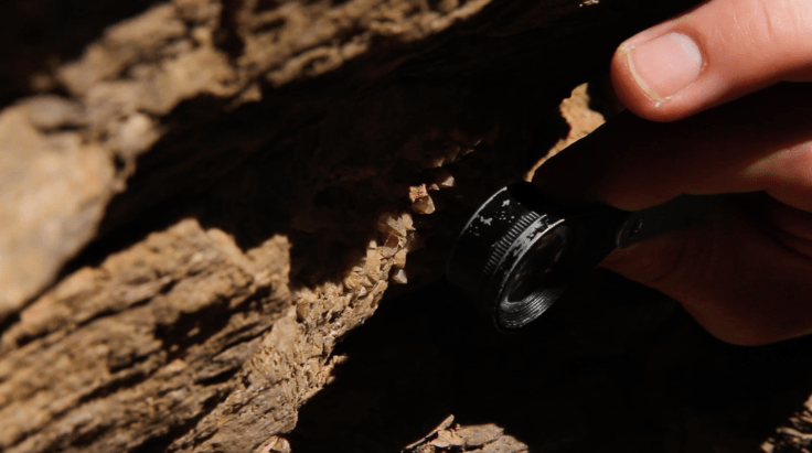 Below, observing quartz crystals formed in the rock, with a hand lens used by geologists.