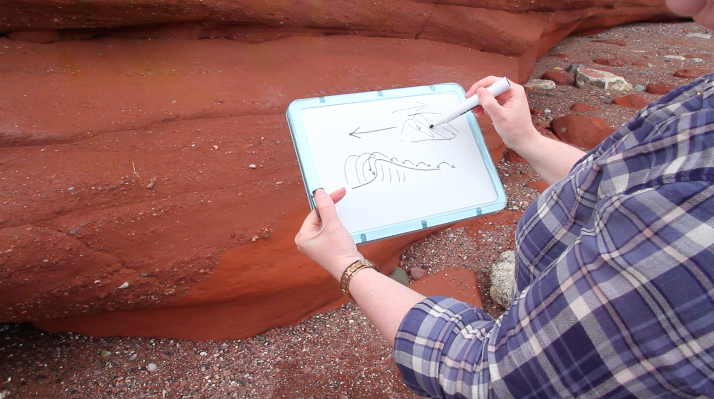 Below Hazel explaining why some layers of sediment go in opposite directions. This is because the direction of the water has changed, so that at different times we see it as it was coming from at us, hence horizontal lines, while at other times we are getting a view in profile, at an angle.