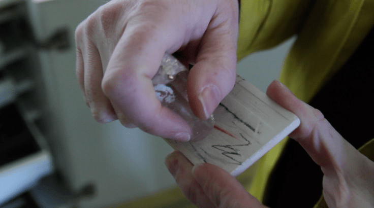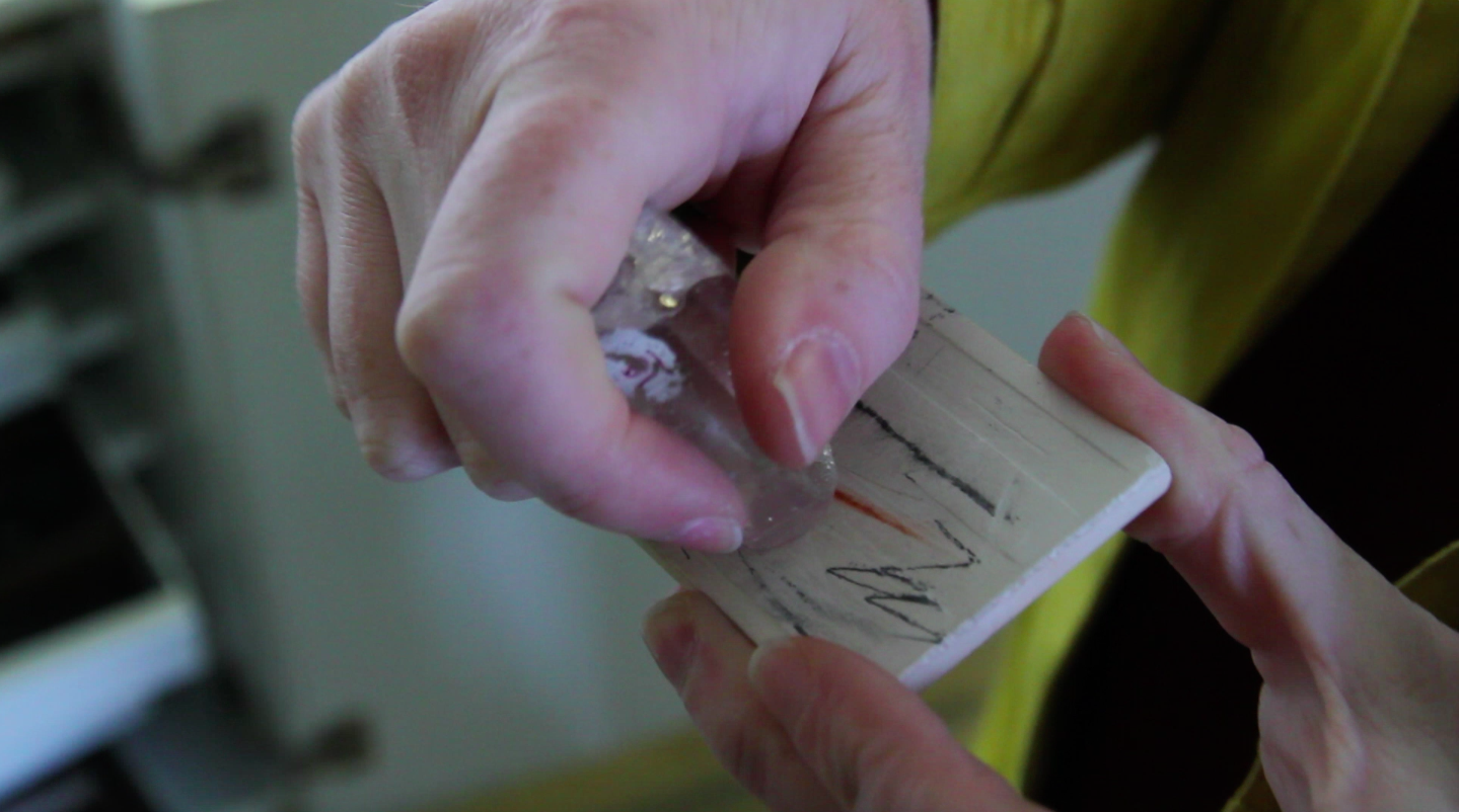 Hazel explained other methods of identification, for instance through making marks with minerals and rocks, observing the traces and colours they leave on a piece of china clay.