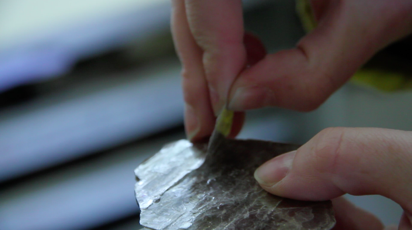 Below Hazel peeling some mica, from which glitter for make up is made.