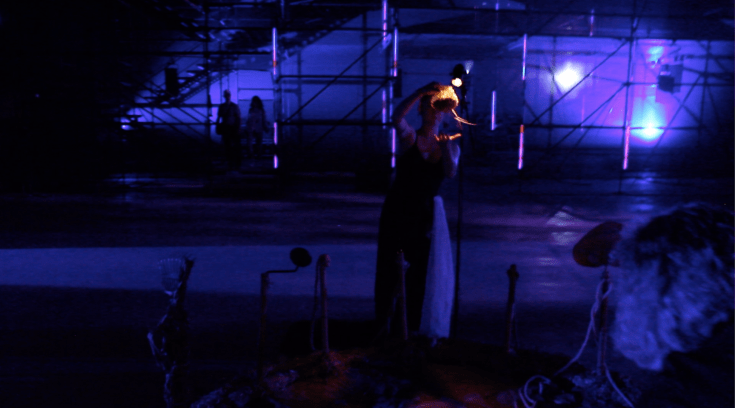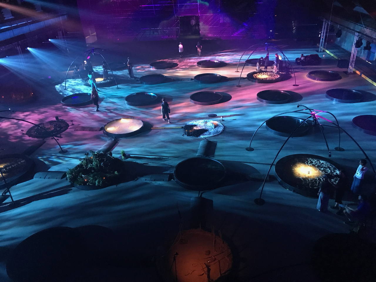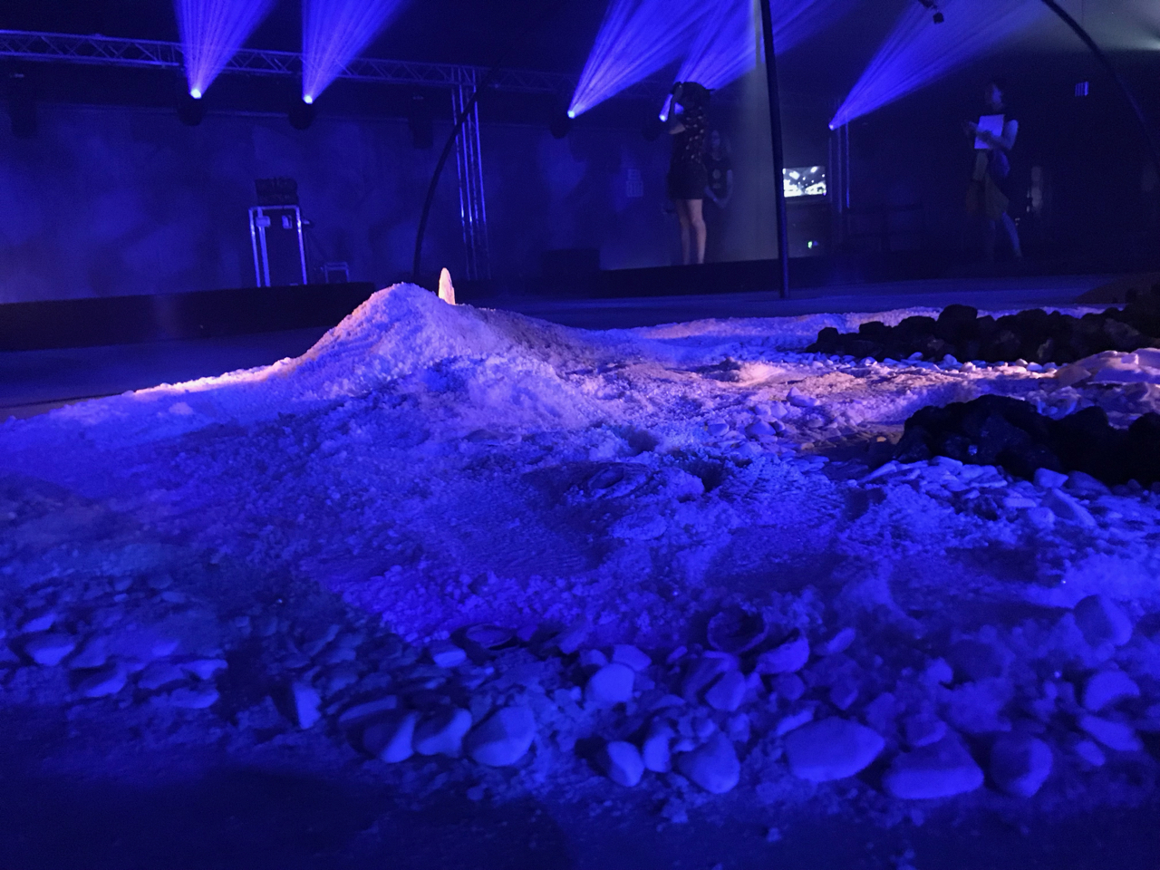 Romain Tardy provided the overall form for our playground – an ice hockey hall converted into a moonscape, containing 36 “pools” distributed evenly across the floor, between two large towers made of scaffolding, on which projection and light were to “perform”.