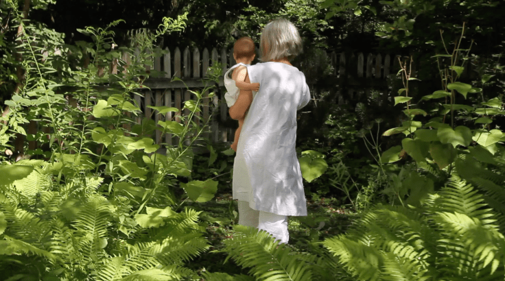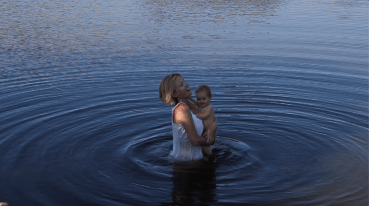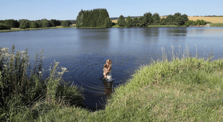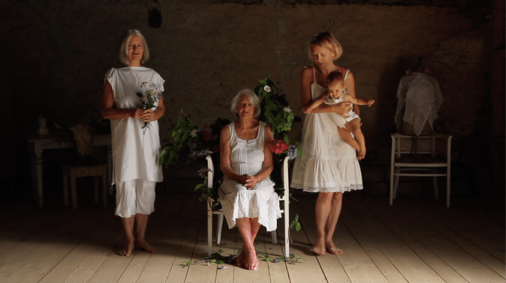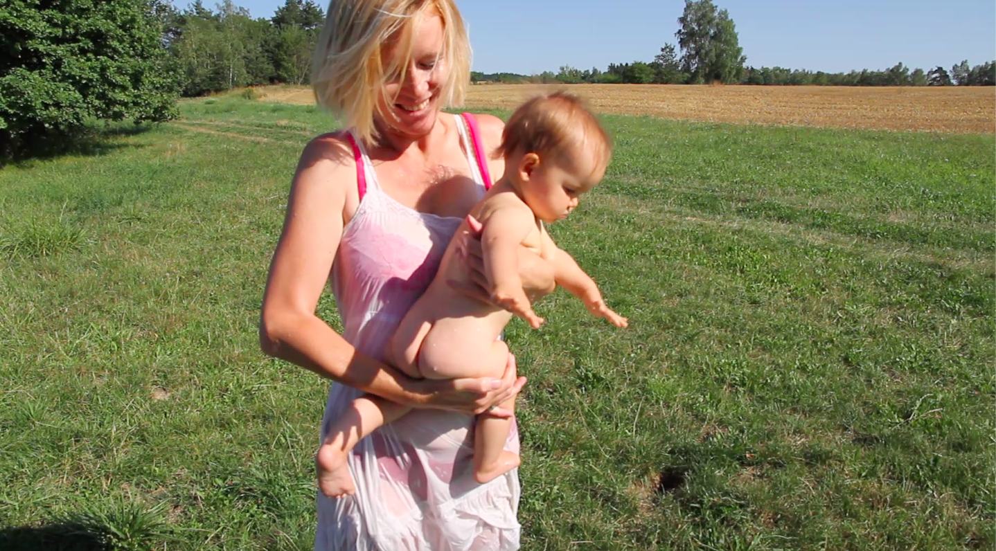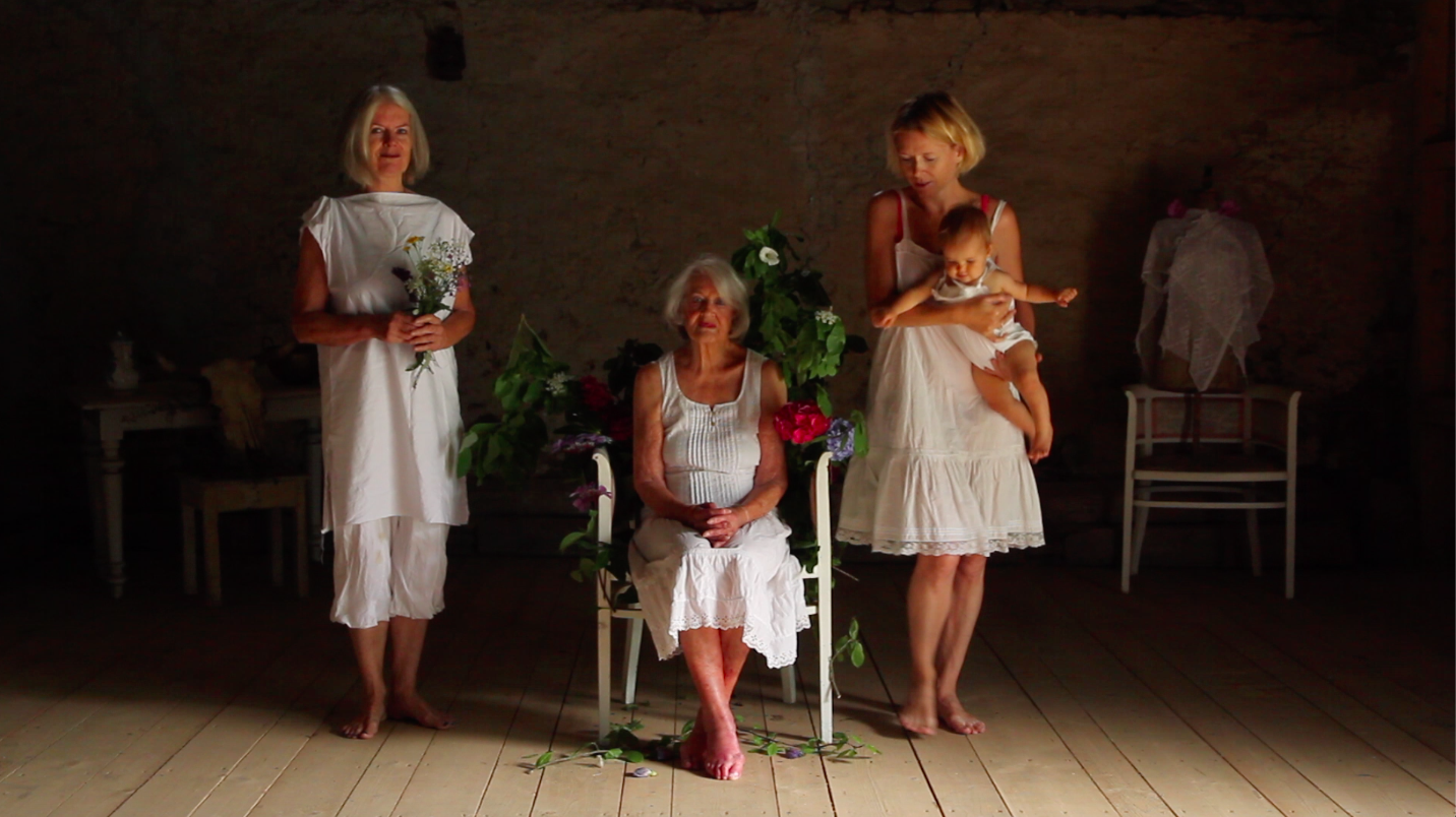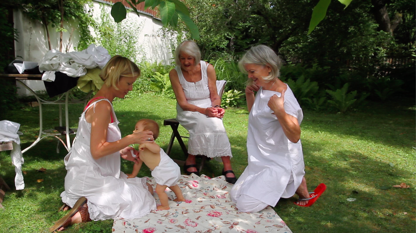 We also shot sequences in the forest, but most importantly we returned to the lake where last year I swam with my 8 month old bump. It was only after watching the footage of emerging from the lake, with my new baby in arms, that I was struck by the way time moves circularly, like a three dimensional spiral (just like the one in the house of my growing up, or the DNA structure?), so that we return to same locations in space and season, but never quite the same place in time. The alterations, brought into a relief by the reoccurring motifs, is what fascinates me. My whole 4 Generations of Women is a meditation on this spiral, and my work brings me the privilege of observing a small segment of it.