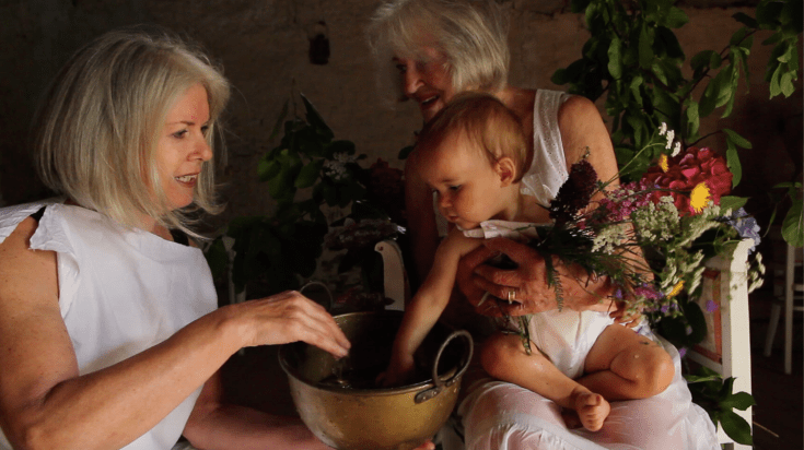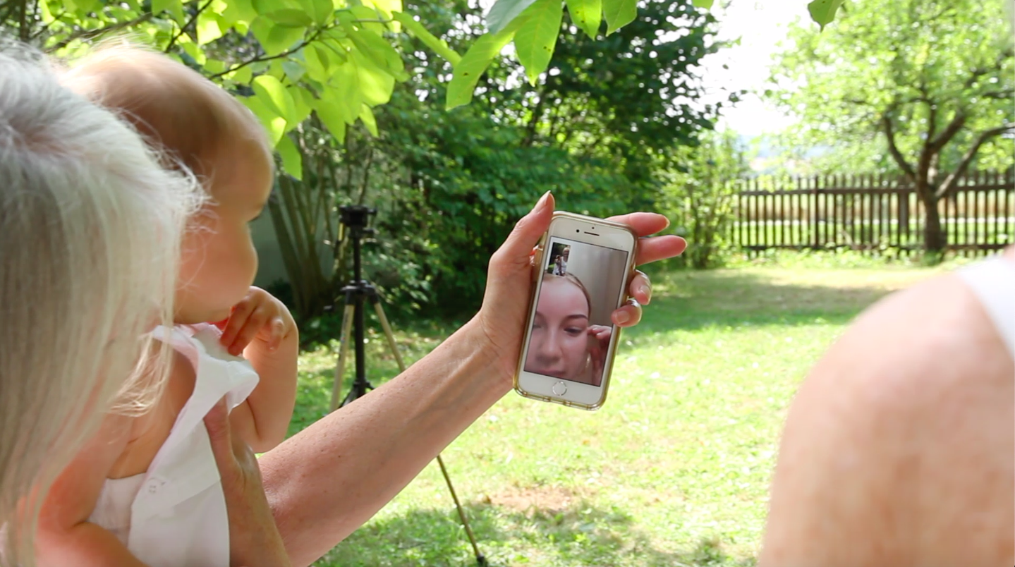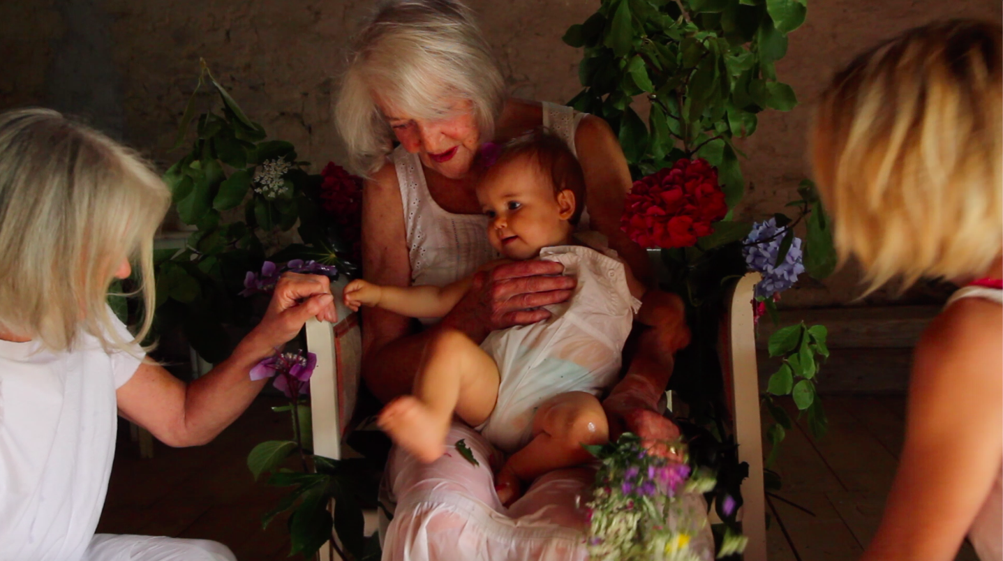 I have decided to revisit the locations of the filming, such the small garden behind my parents’ house, where we prepared our cake in 2015, and this time we dressed here for our ritual of welcoming the new baby. To connect all the women and also to bring in the reality of the modern family, divided by distance and connected by technology, we also called my older daughter on FaceTime. She was in Greece at the time.