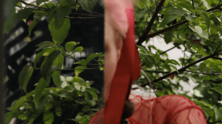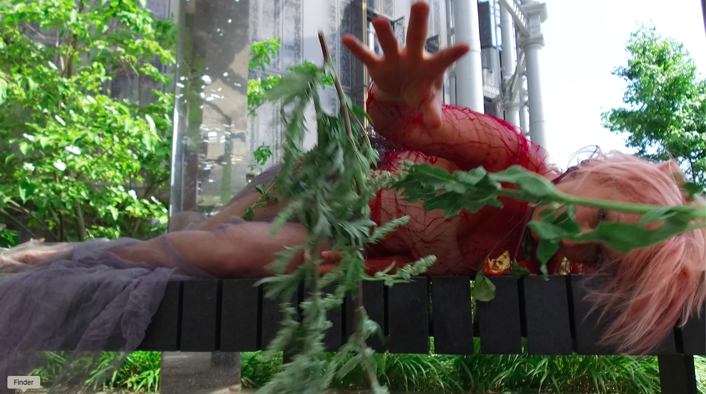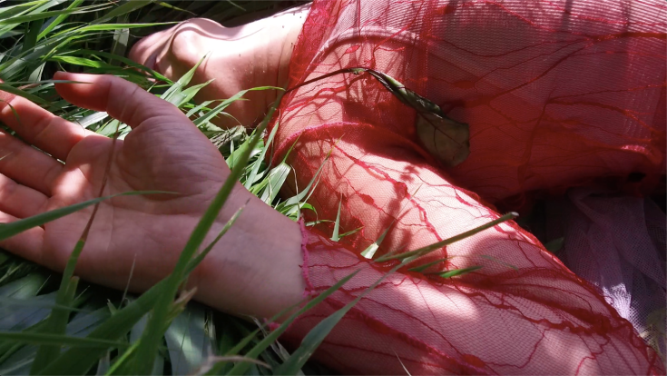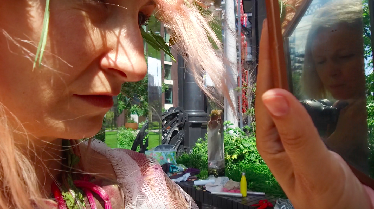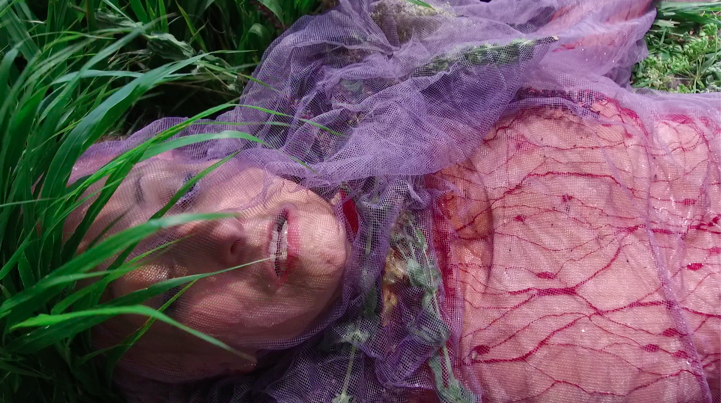 She looks for liberation in movement, looking for a crack in the impossible space. She wants to find a way out of here. The vegetation on her own body is a reminder of the sensory world, where things smell, taste, decay. They are her palette of references, embodied memories externalised.