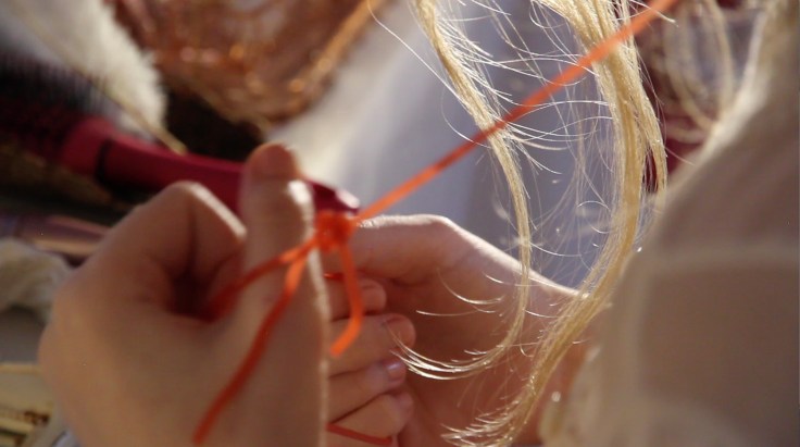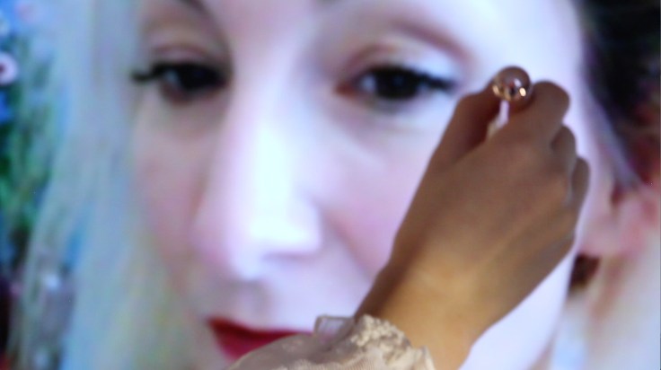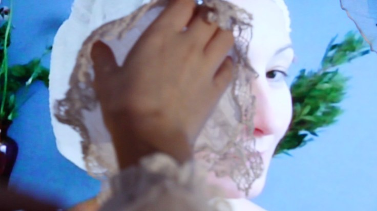At the end of the filming the young woman “here” covers the screen with an embroidered fine fabric which she previously wore. This veil becomes the tangible version of the transparent screen.