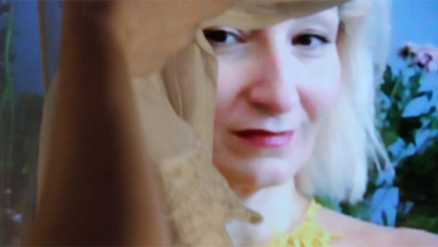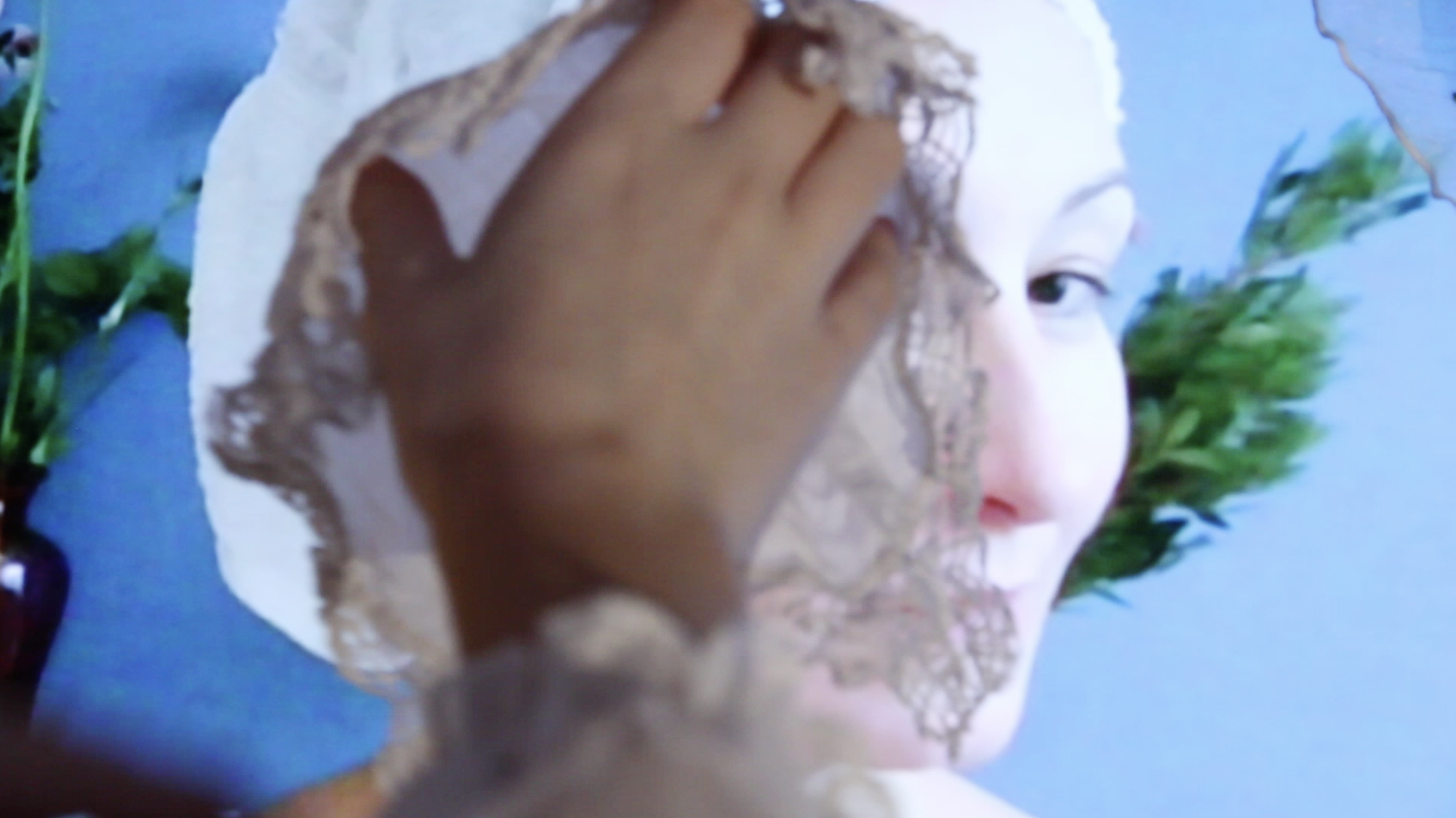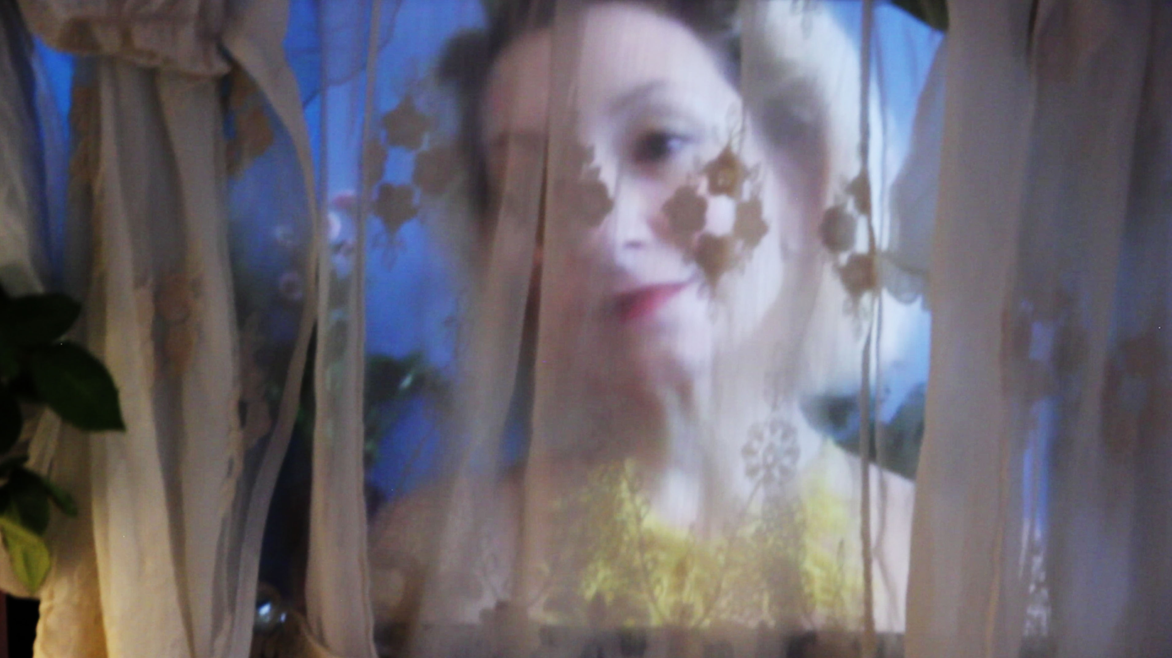 At the end of the filming the young woman “here” covers the screen with an embroidered fine fabric which she previously wore. This veil becomes the tangible version of the transparent screen.