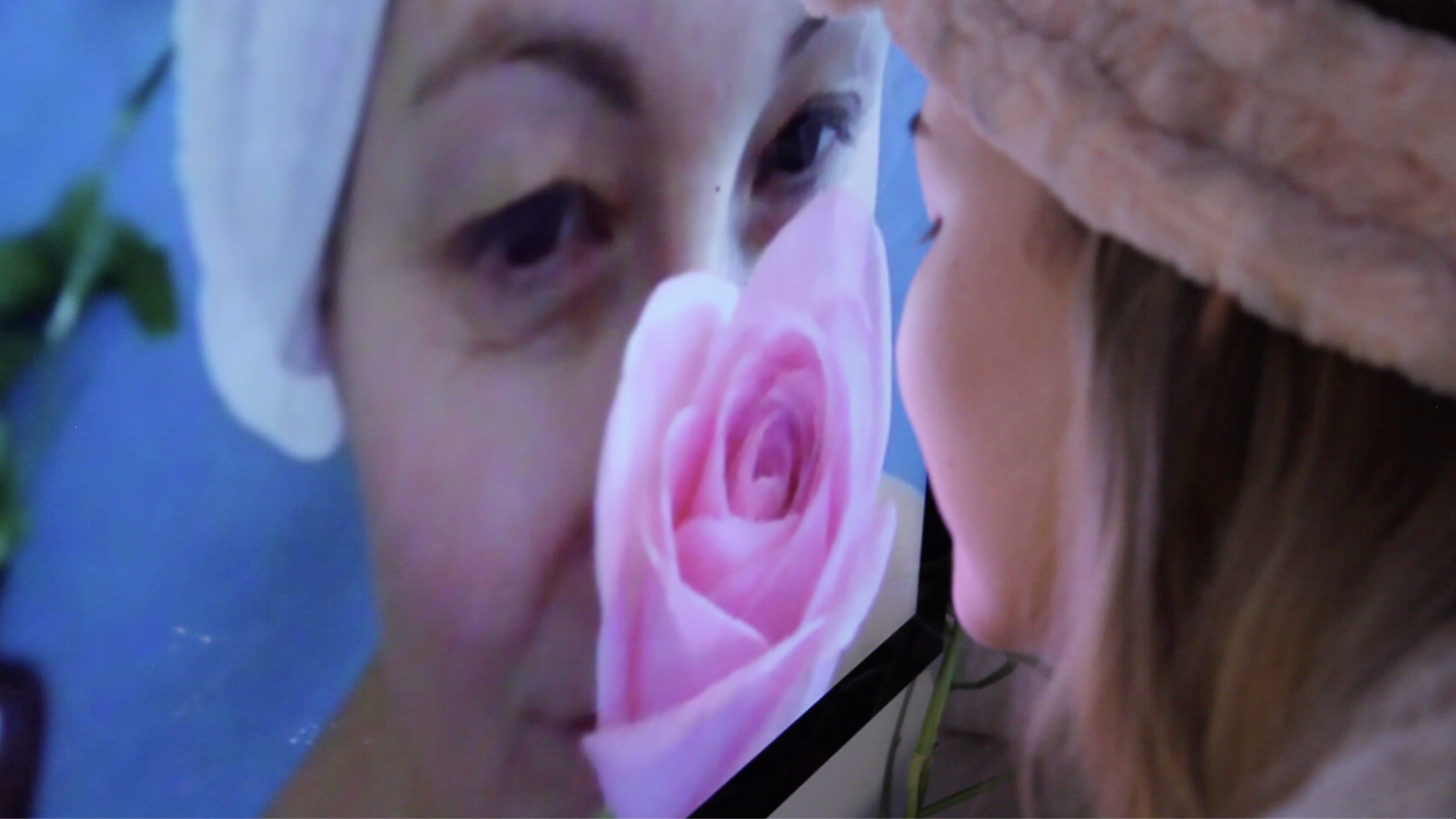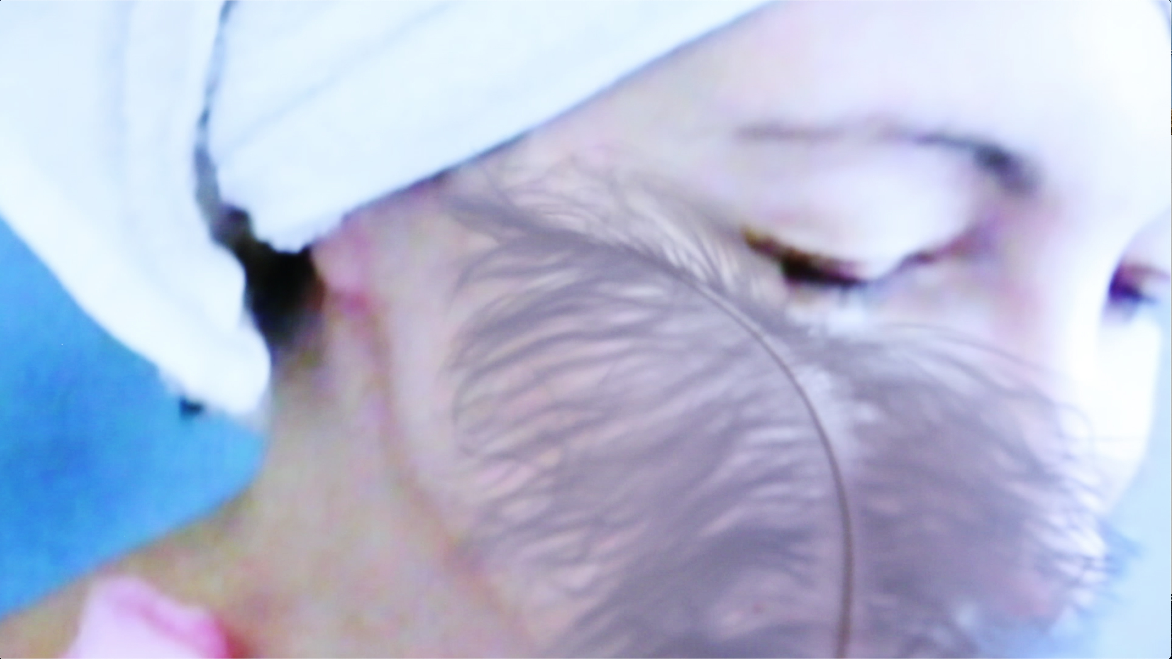 Animation is introduced with the help of a blow dryer, creating a momentary sense of the woman inside the screen being an astronaut, floating in zero gravity, weightless.