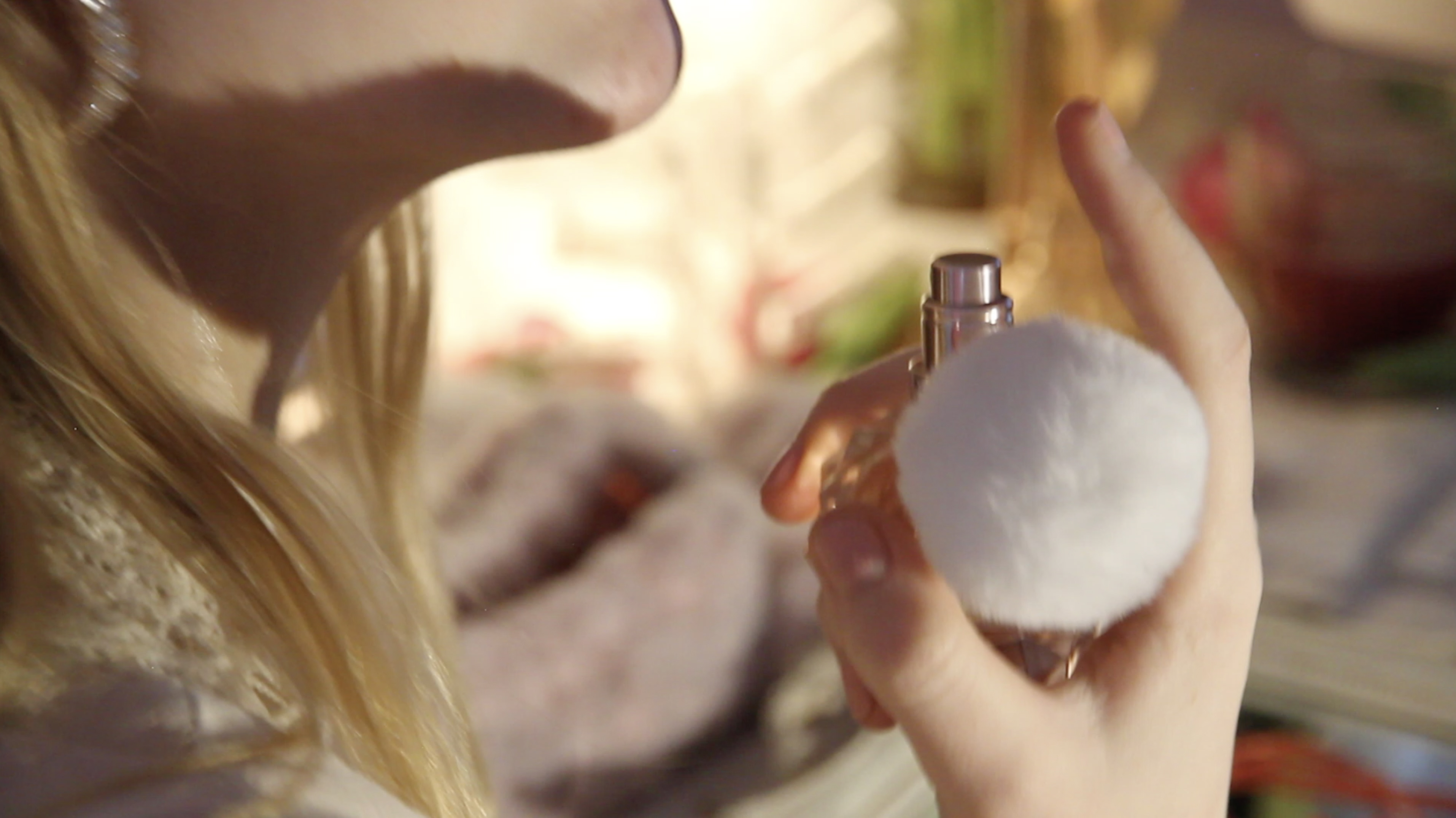 To feed the imagination during the shoot, I create an atmosphere in the room of enveloping pink glow, of warmth and sensual pleasures. There are plants touching the computer, flowers, as well as make up tools, creams and perfumes, sweets and feathered lamps glowing invitingly.