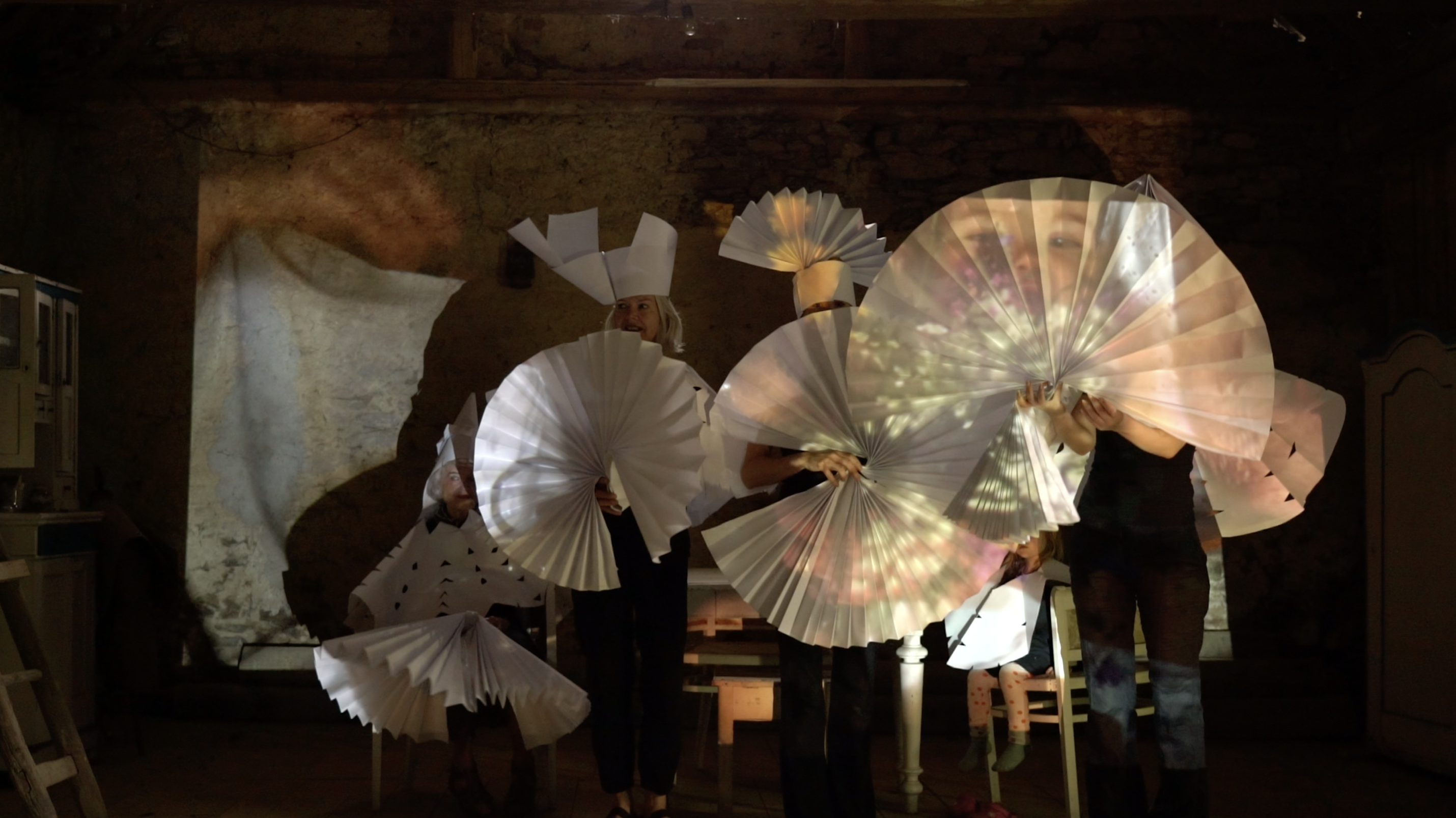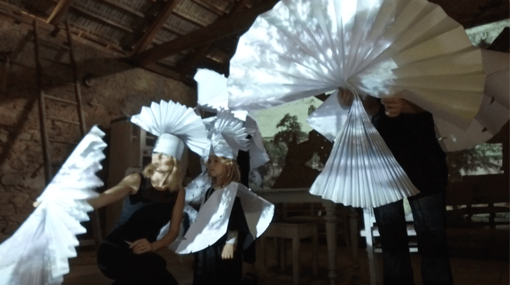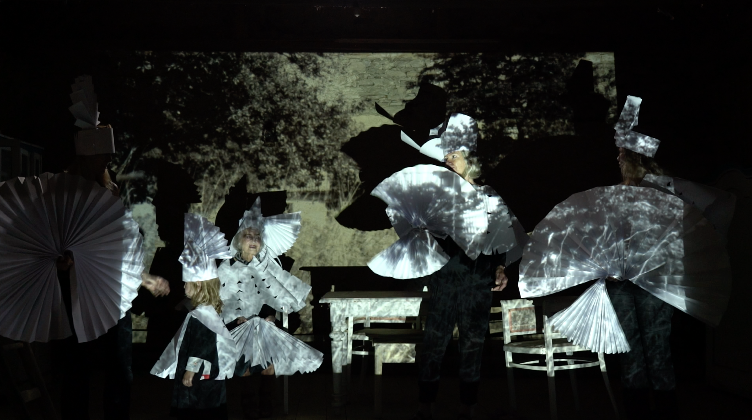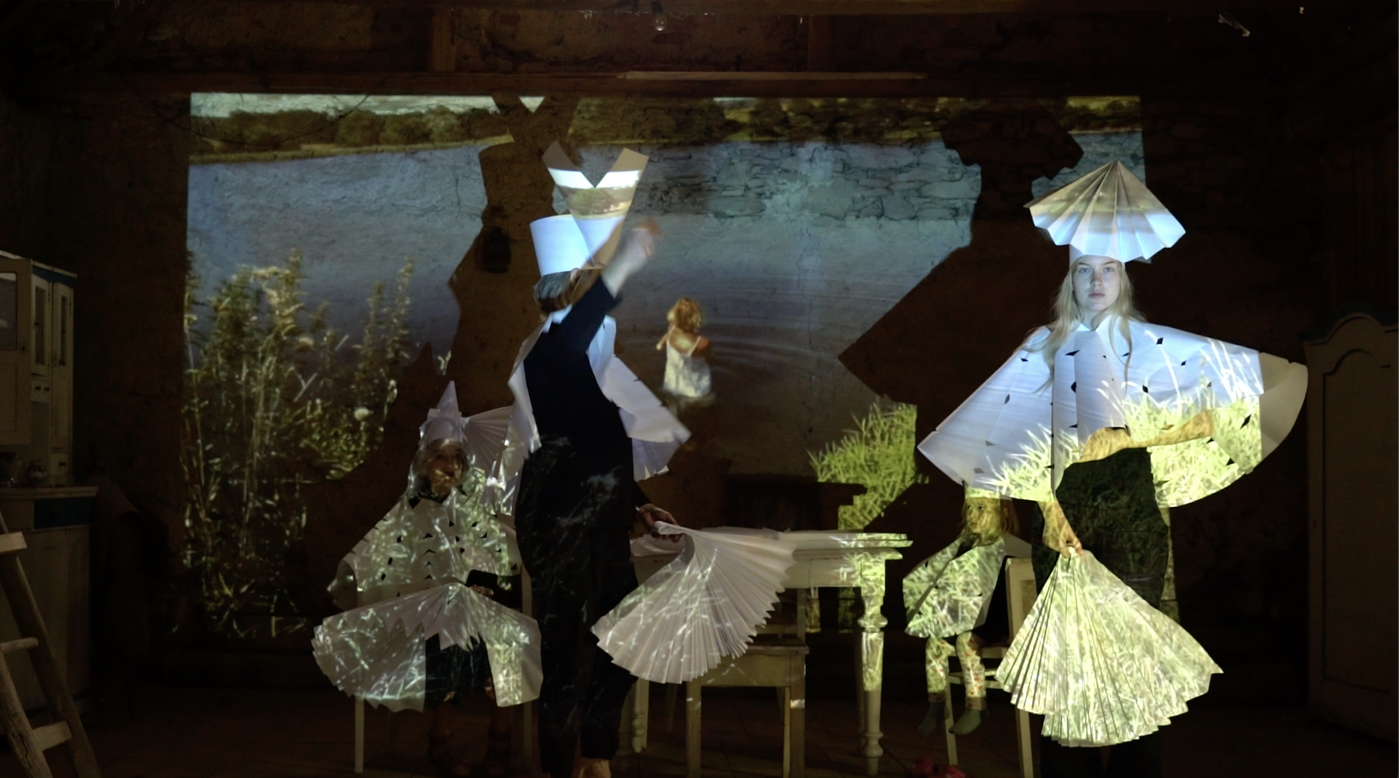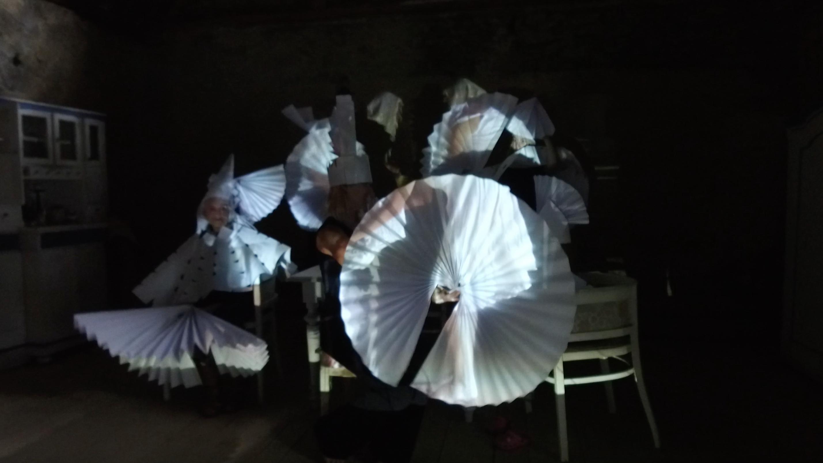 I made costumes for us out of paper, so that they could function as fragments of a screen for the images to fall upon. I was also drawn to working with paper, firm yet fragile, because it gives a feeling of something provisional and theatrical. Clothes made of paper are not practical, or functional. Wearing them gives our performance a quality of a childhood play, a kind of heightened reality of the make believe. A space of play which is a space of infinite possibilities. And therefore future.