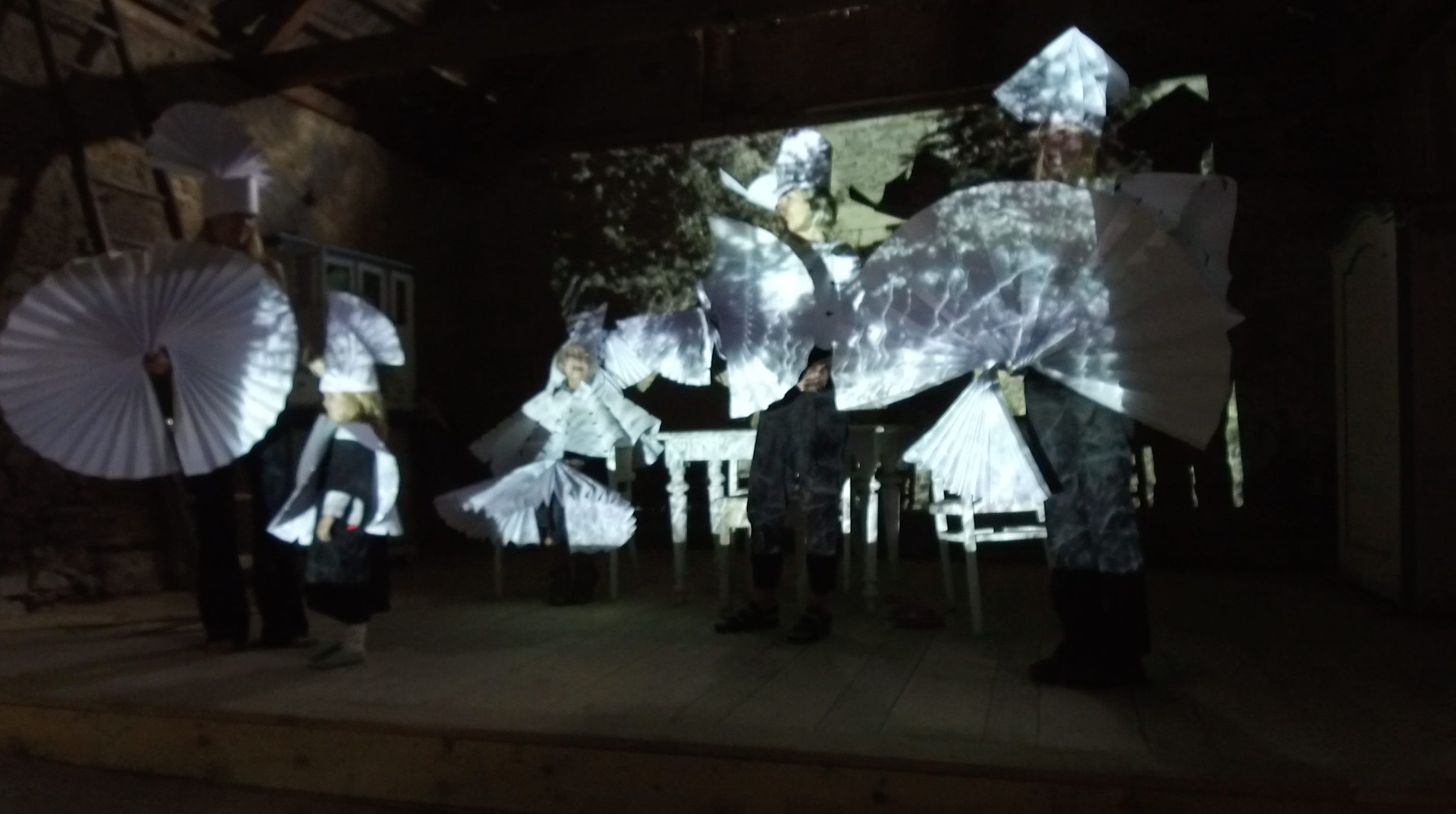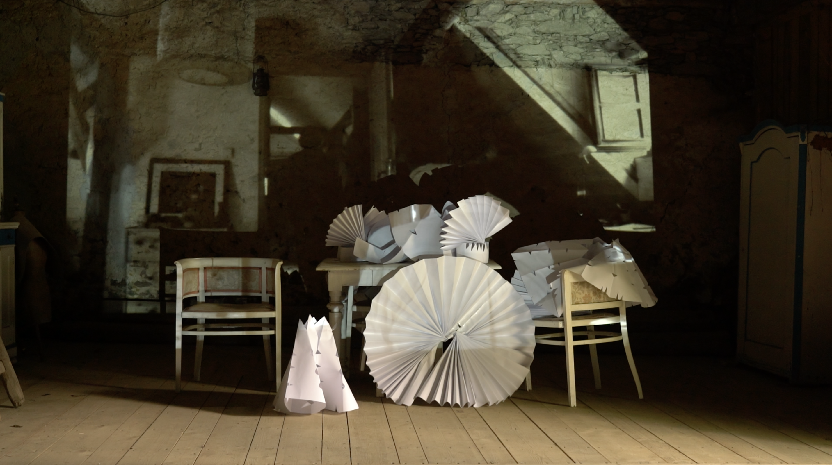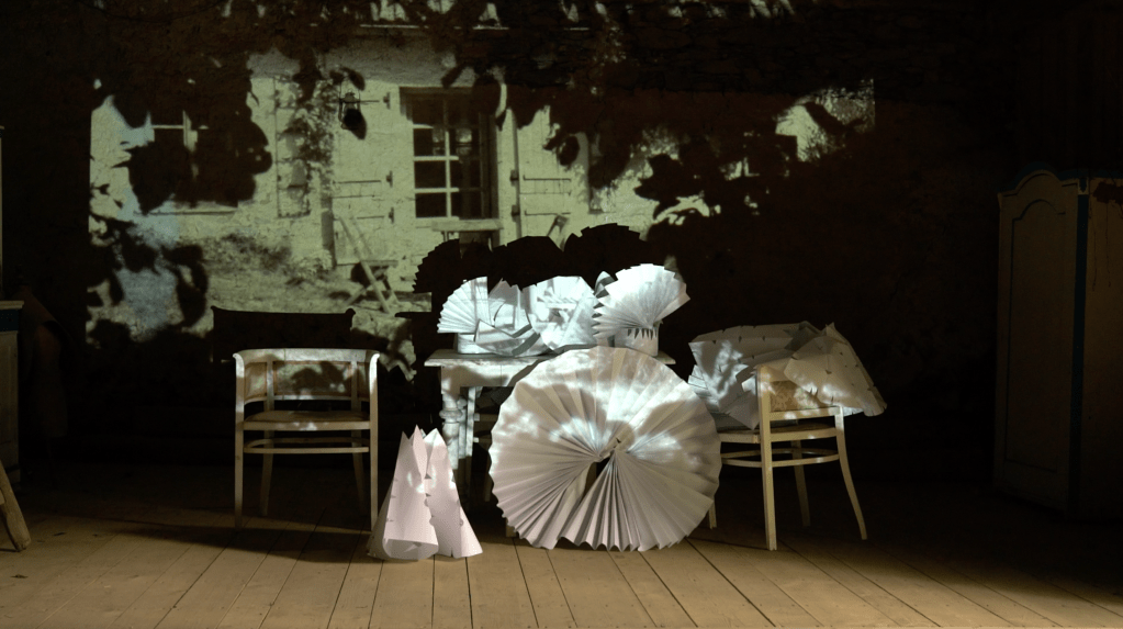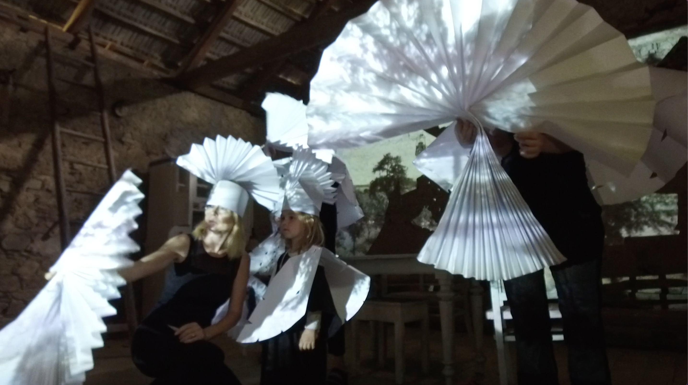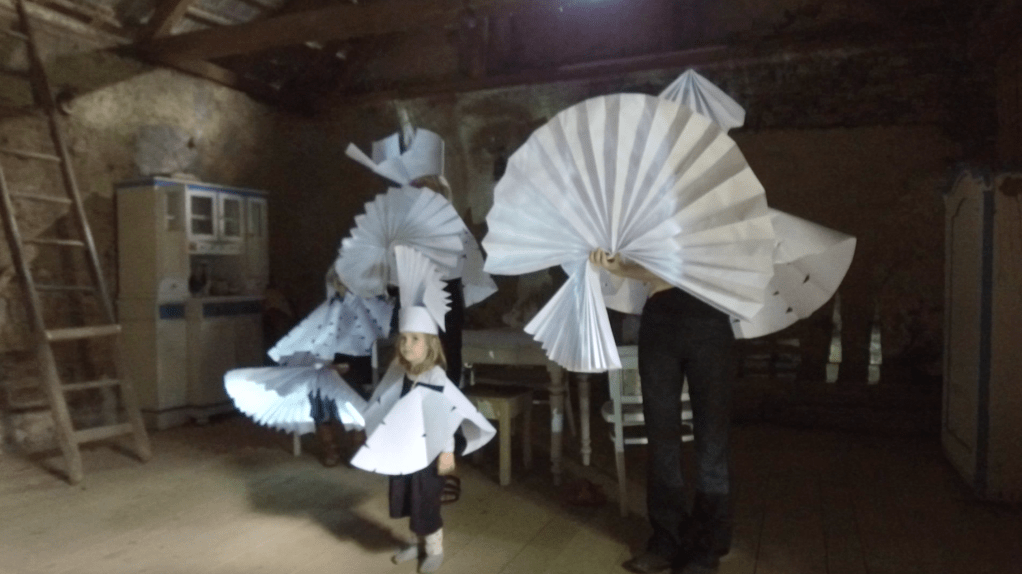 I made costumes for us out of paper, so that they could function as fragments of a screen for the images to fall upon. I was also drawn to working with paper, firm yet fragile, because it gives a feeling of something provisional and theatrical. Clothes made of paper are not practical, or functional. Wearing them gives our performance a quality of a childhood play, a kind of heightened reality of the make believe. A space of play which is a space of infinite possibilities. And therefore future.