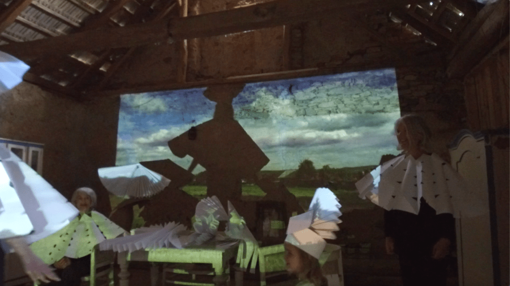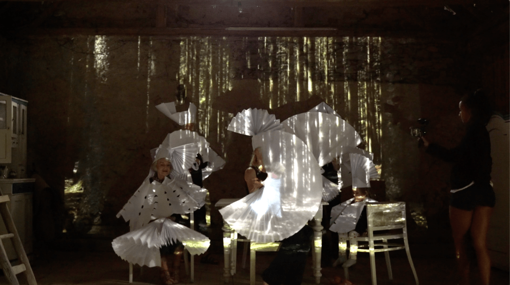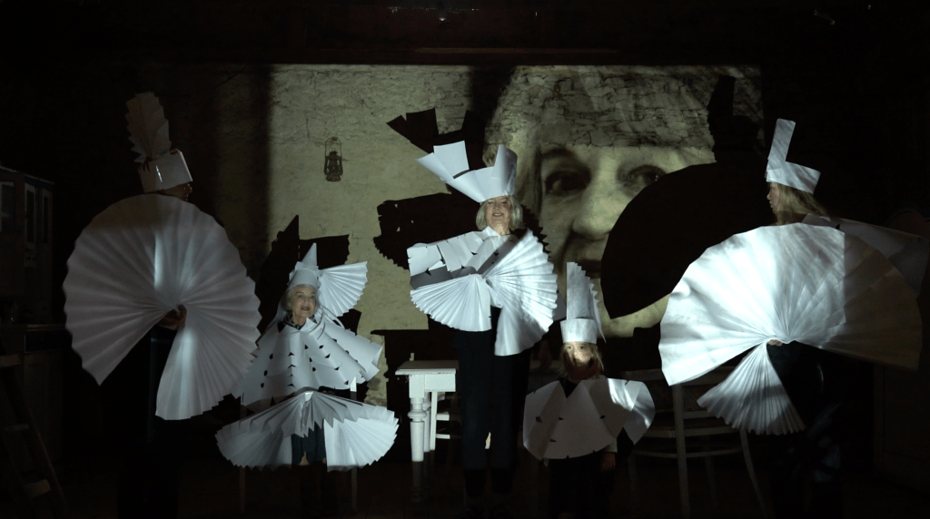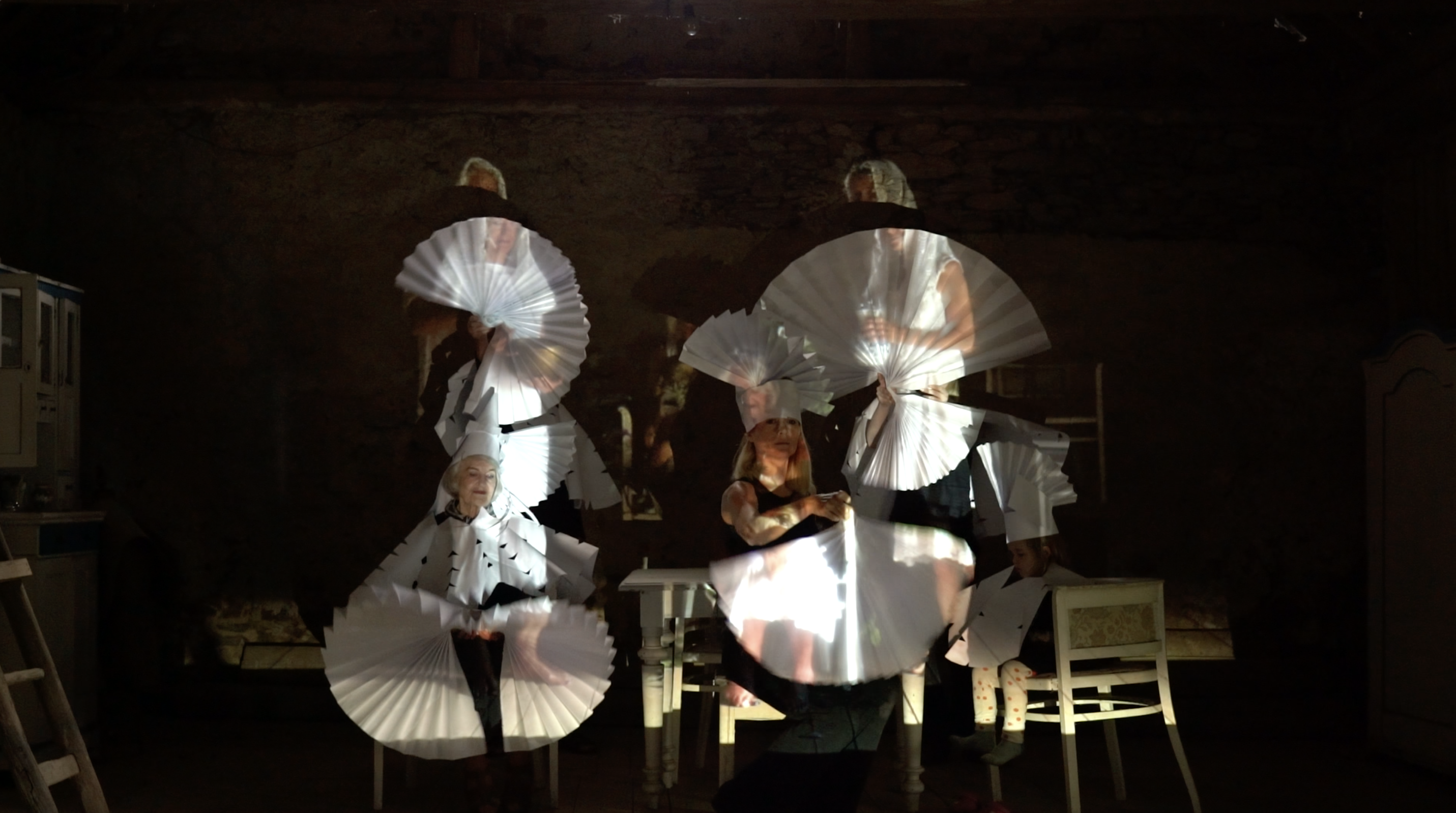 I thought much about this and decided on a performance in the location of the summer house and the barn in particular. This is the place that has become the heart of the project. An empty stage, with a white table and chairs, evoking a domestic space as well as a theatre. I wanted to use a projection of the moving images capturing the five of us over the years, as a way of inviting the ghosts to share the stage with us.