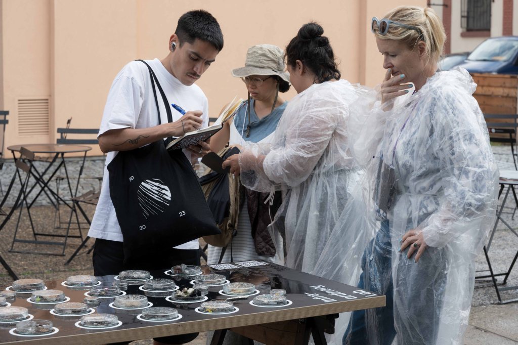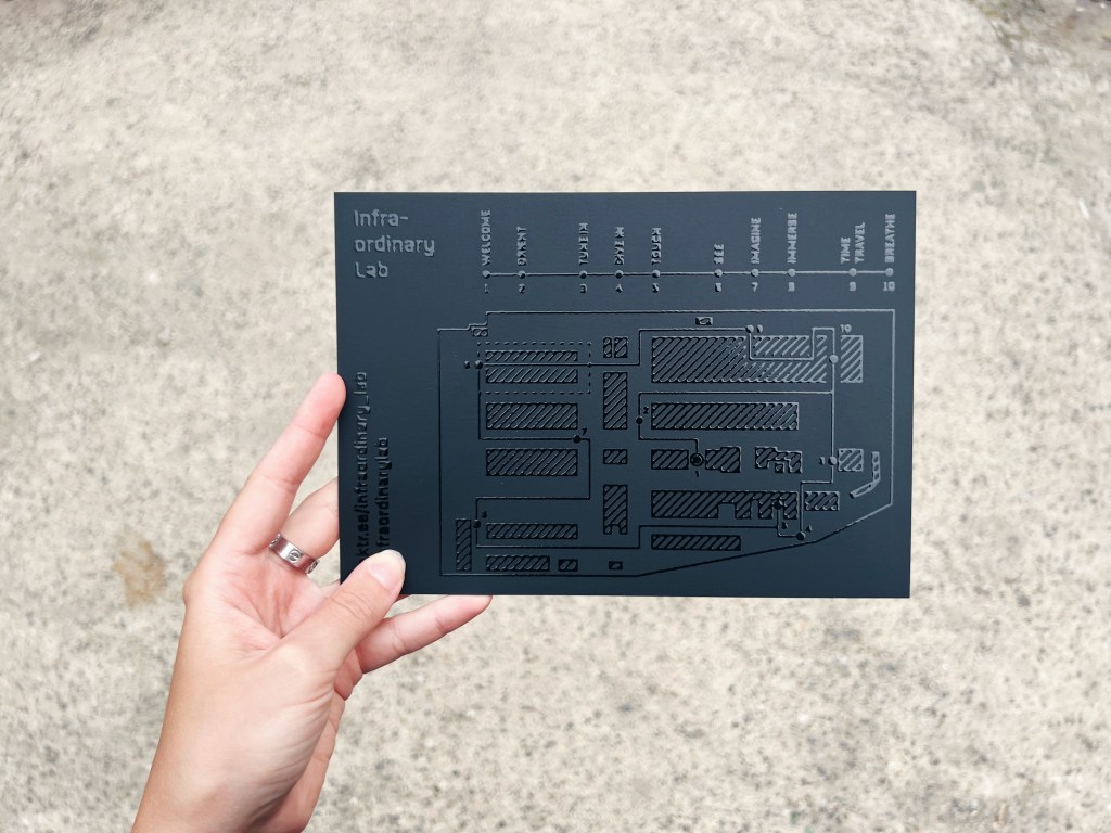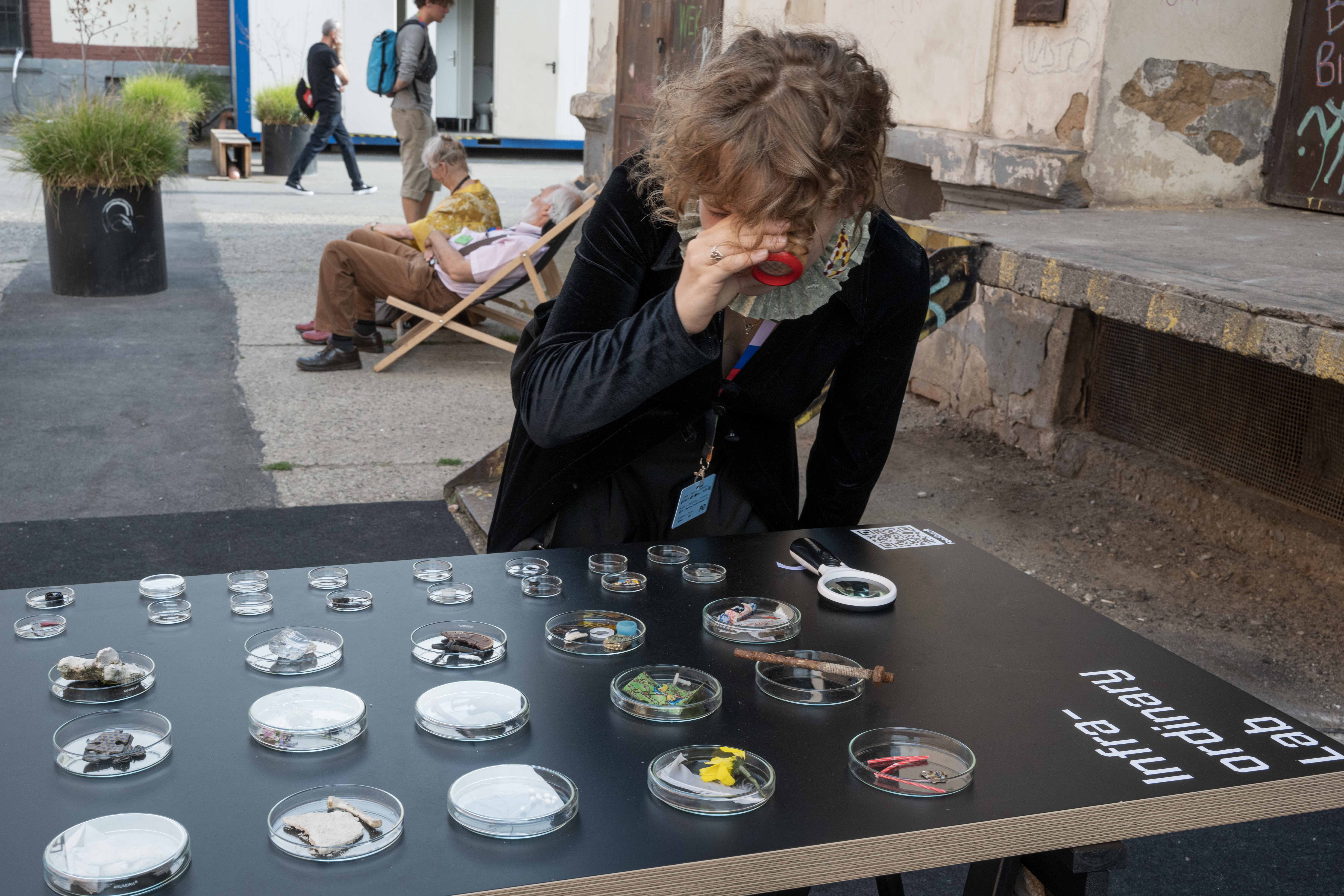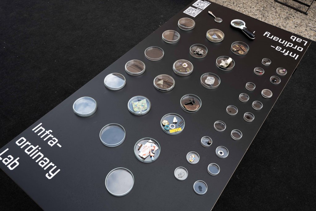 The participant’s journey started at the base of the lab, where a table was displayed, on which discarded fragments of the everyday life, collected by the performers and participants, were exhibited in petri dishes, lending them an altogether unique aura of something precious. This set out the tone for the rest of experience, an audio-walk consisting of stops (or stations), which each participant navigated individually, with the help of headphones and a printed map, which they received at the start of the journey. The intention was to shift, ever so slightly, the habitual way of perceiving and instead reveal the infra-ordinary aspects of the environment and participants’ own bodies and their mysterious mechanics.
