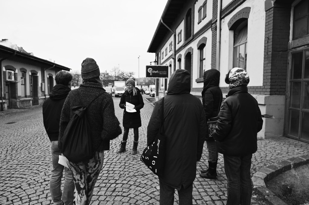 The walk took the participants into the peripheral areas of the market, as well as into some of the functioning interiors (i.e. food market hall, digital shop), introduced them to some of the historical facts, while also giving them a sense of their own orientation within the larger environment of the city. This was done with the help of 10 audio tracks corresponding to 10 stops. Each of the unique stations offered a particular focus, summarised by these words, which were also invitations: welcome, orient, tune in, dive in, touch, see, imagine, immerse, time travel, breathe.