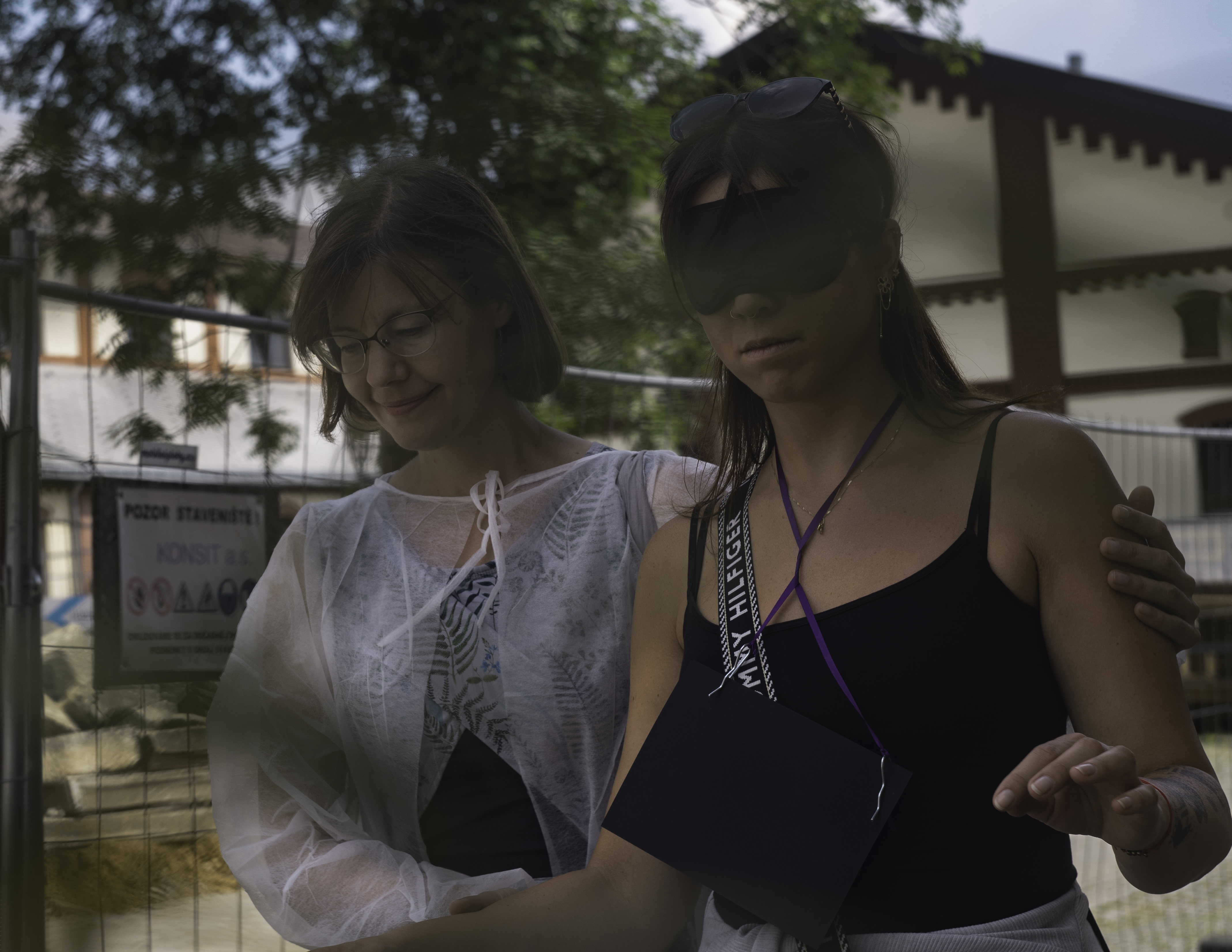 “Blindfold discovery. In my work I am a leader. It was a wonderful change to put myself in the hands of the guide and be led. It was great to have the variety of sensations, both the man-made plastic barrier tape, the wooden sign and the delicate flutter of the tree leaves and the robust stalks of the plants. So nice to have both worlds sharing focus. “